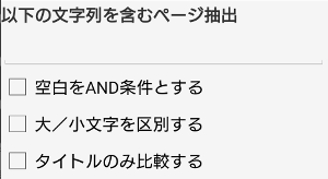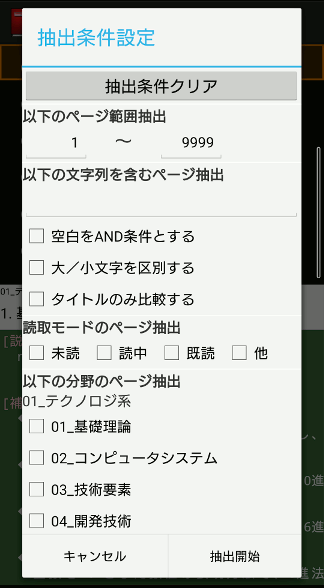 保存した設定内容は、次回起動時に反映します。 抽出条件を指定せずに抽出開始ボタンをタップすると、全ページをページ一覧に表示します。 区切り線跨ぎの複数条件指定は『AND』検索となります。 |