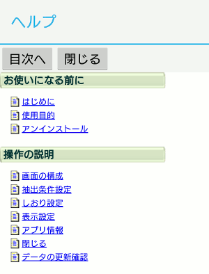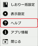 OverFlowメニューの[ヘルプ]をタップすると、ヘルプ画面を表示します。