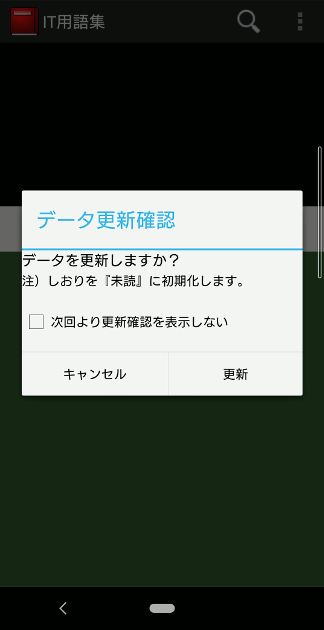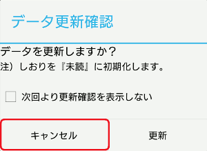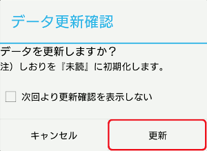 ● 更新 のタップにより、 しおりを全て『未読』に初期化し、 データの差し替えを実行してから確認メッセージを閉じます。 |