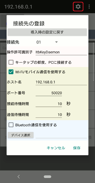 ActionBarの[通信設定]アイコンをタップし、設定画面を表示します。 |