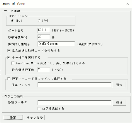本アプリのご使用に先立ち、キー操作を行う接続先のパソコン/サーバに ● 遠隔キーボード ver 2.0.0 以降を、導入頂く必要があります。 【注意】 ● 遠隔キーボード ver 1.2.2 以前のバージョンでは本アプリの一部機能を、ご使用頂けません。 遠隔キーボードのインストーラを入手→導入→起動してから、 以下の設定を確認してください。 |