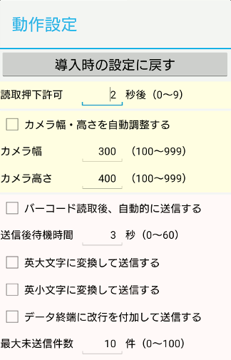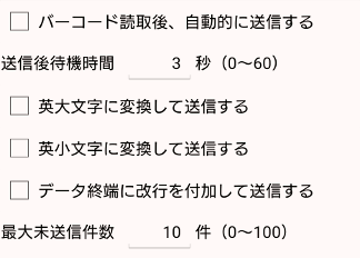 以下の設定値を変更することができます。 バーコード読取後、自動的に送信する● 送信後待機時間 (0~60秒) 英大文字に変換して送信する 英小文字に変換して送信する データ終端に改行を付加して送信する● 最大未送信件数 (0~100件) |