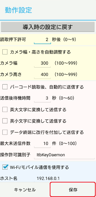 [保存]ボタンをタップし、入力した設定値を保存します。 |