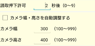 以下の設定値を変更することができます。 ● 読取押下許可 (0~9秒後) カメラ幅・高さを自動調整する● カメラ幅 (100~999) ● カメラ高さ (100~999) |