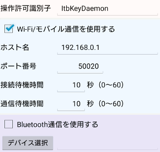 以下の設定値を変更することができます。 ● 操作許可識別子 (英数20文字以内) Wi-Fi/モバイル通信を使用する● ホスト名 (ホスト名/IPアドレス) ● ポート番号 (49512~65535) ● 接続待機時間 (0~60秒) ● 通信待機時間 (0~60秒) Bluetooth通信を使用する● デバイス名 (ペア設定済のデバイス) |