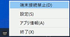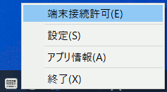 接続を禁止に切り替えた端末接続を、許可に切り替えます。 タスクトレイの『遠隔キーボードアイコン』を右クリックし、メニューを表示します。 |