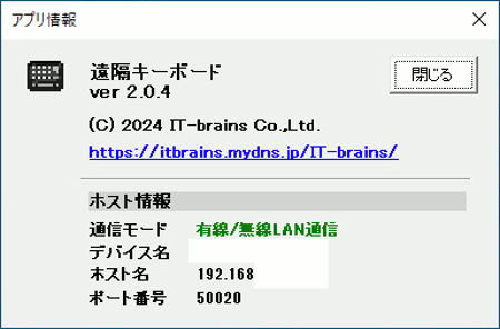 当画面では、以下の内容を確認できます。 ●アプリ名とバージョン ●著作者名 ●著作者URL 『著作者URL』のクリックで、著作者ホームページを表示します。 ホスト情報 ●通信モード ●デバイス名 ●ホスト名 ●ポート番号 『ホスト情報』は、本アプリが動作している端末の情報です。 クライアントアプリの接続情報を設定する際に、ご利用ください。 |